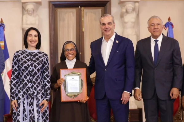 Sor Agripina Acosta, directora del Hogar de Ancianos Desvalidos La Santísima Trinidad Acosta, en representación de la institución, fue reconocida por su destacada labor de acogida y cuidado a personas mayores durante 57 años. | Fuente: https://presidencia.gob.do